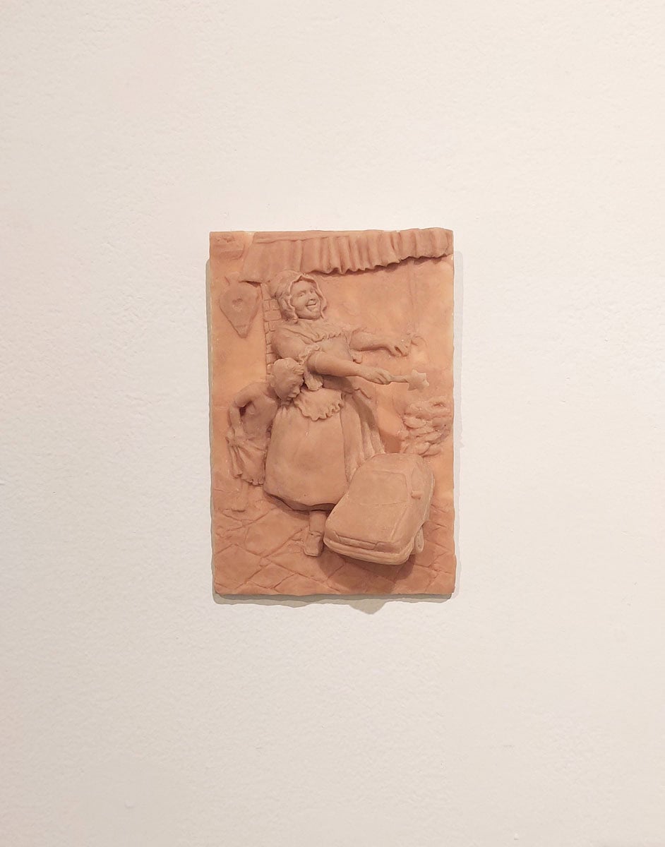 Guy Bernard Reichmann, Aschenputtel, there’s a Ford in Your Future (from the series ‘1986 1993’), 2025, Polymer clay on wood, 18x12 cm