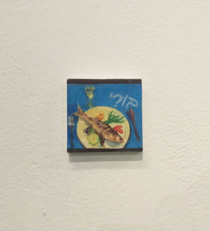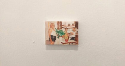 Guy Bernard Reichmann, Grandpa, grandma, mom and an omelet (from the series ‘1986 1993’), 2026, Gouache and watercolor on canvas, 5x7 cm